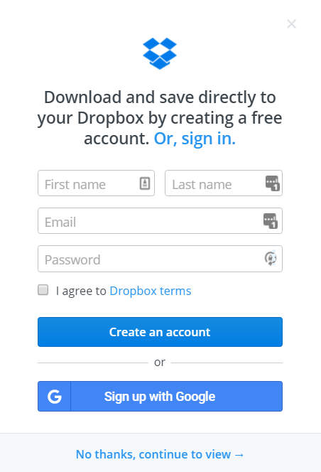 It looks like you have to sign up for Dropbox to view and download the file, doesn’t it? That’s a very deliberate design choice on their part. You actually don’t have to sign up to view the file – note the “no thanks” link hidden at the bottom – but Dropbox would much prefer that you sign up, so they bury that option instead of giving it equal weight.